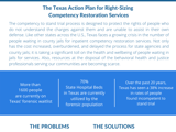 Like other states across the U.S., Texas faces a growing crisis in the number of people who are waiting in county jails for inpatient competency restoration services after being declared incompetent to stand trial. Not only has this increased costs and overburdened state agencies and county jails, but it also is taking a significant toll on the health and well-being of people waiting in Texas jails for inpatient competency restoration services.