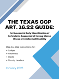 Article 16.22 of the Texas Code of Criminal Procedure prescribes the procedures for early identification of individuals suspected of having a mental illness or intellectual disability who are involved in the criminal justice system. This document offers guidance on completing a 16.22 report.